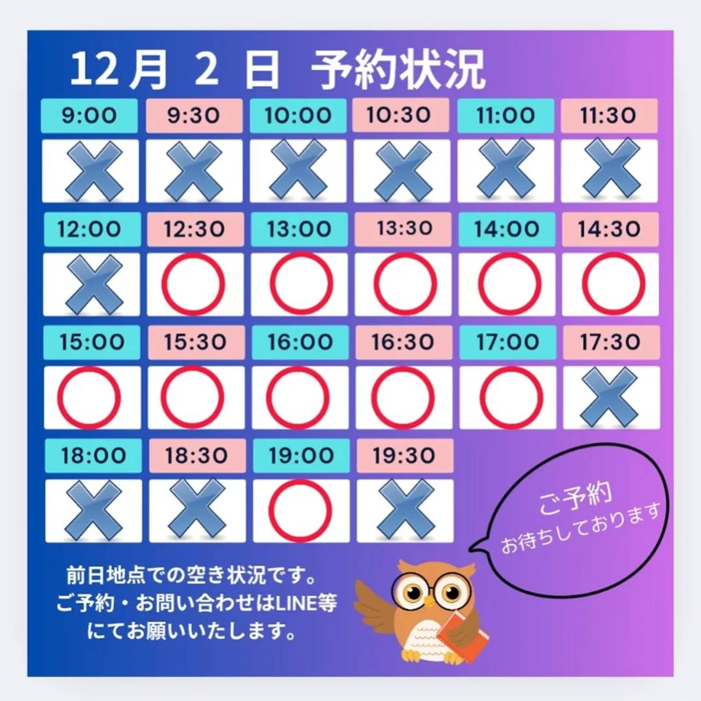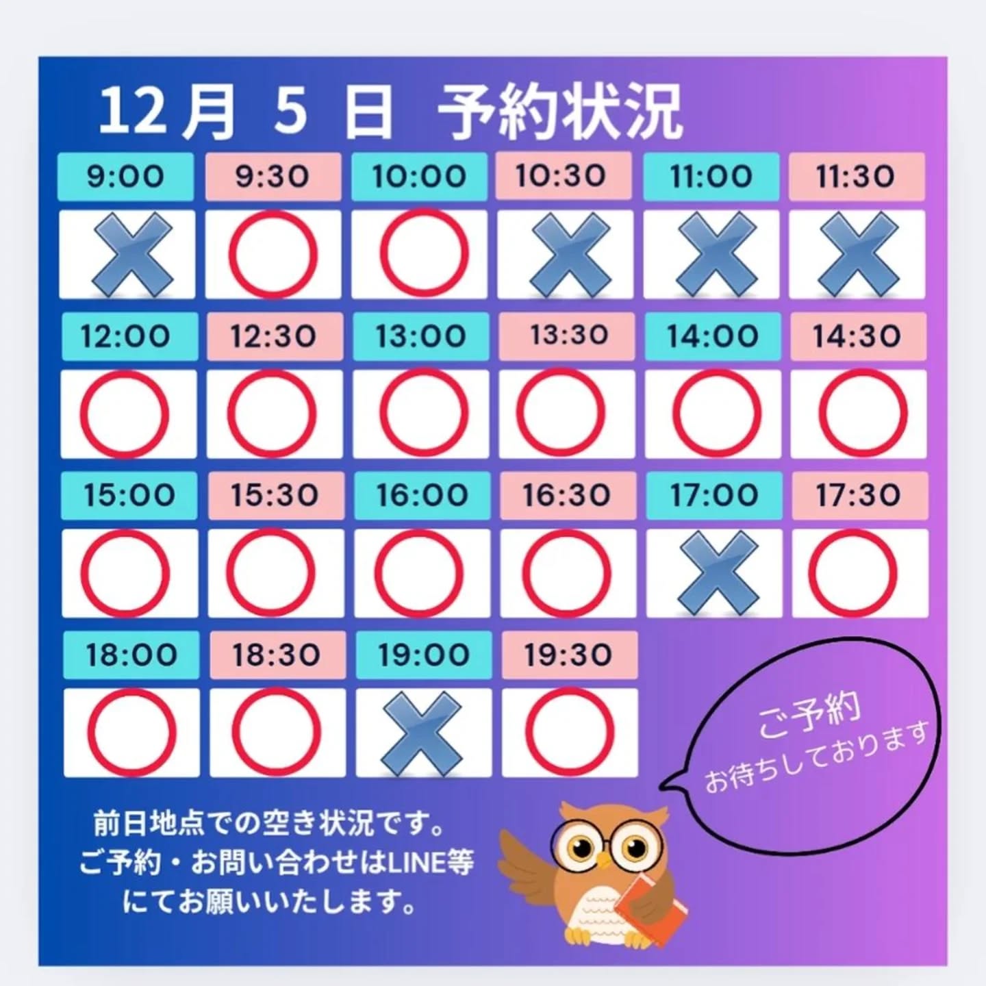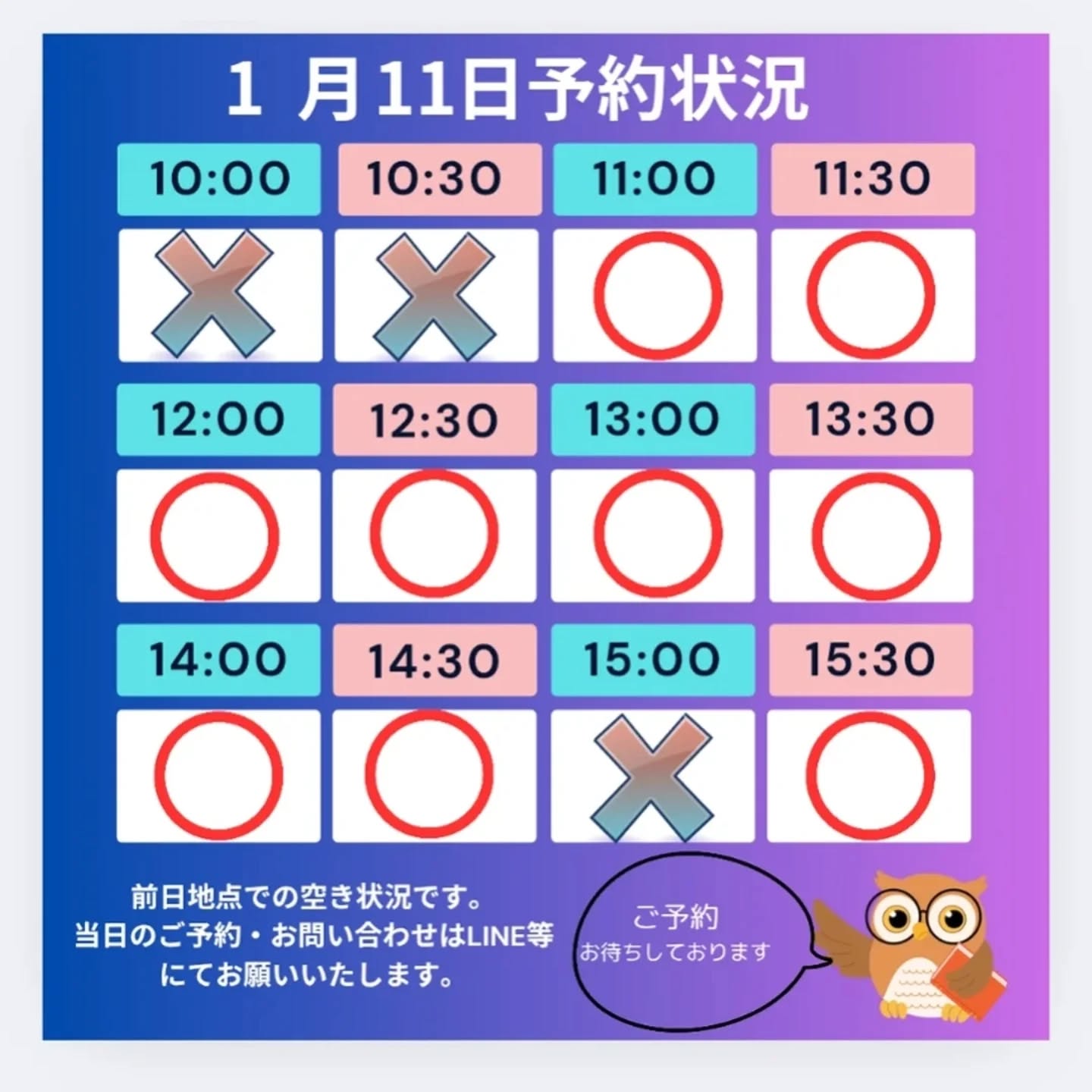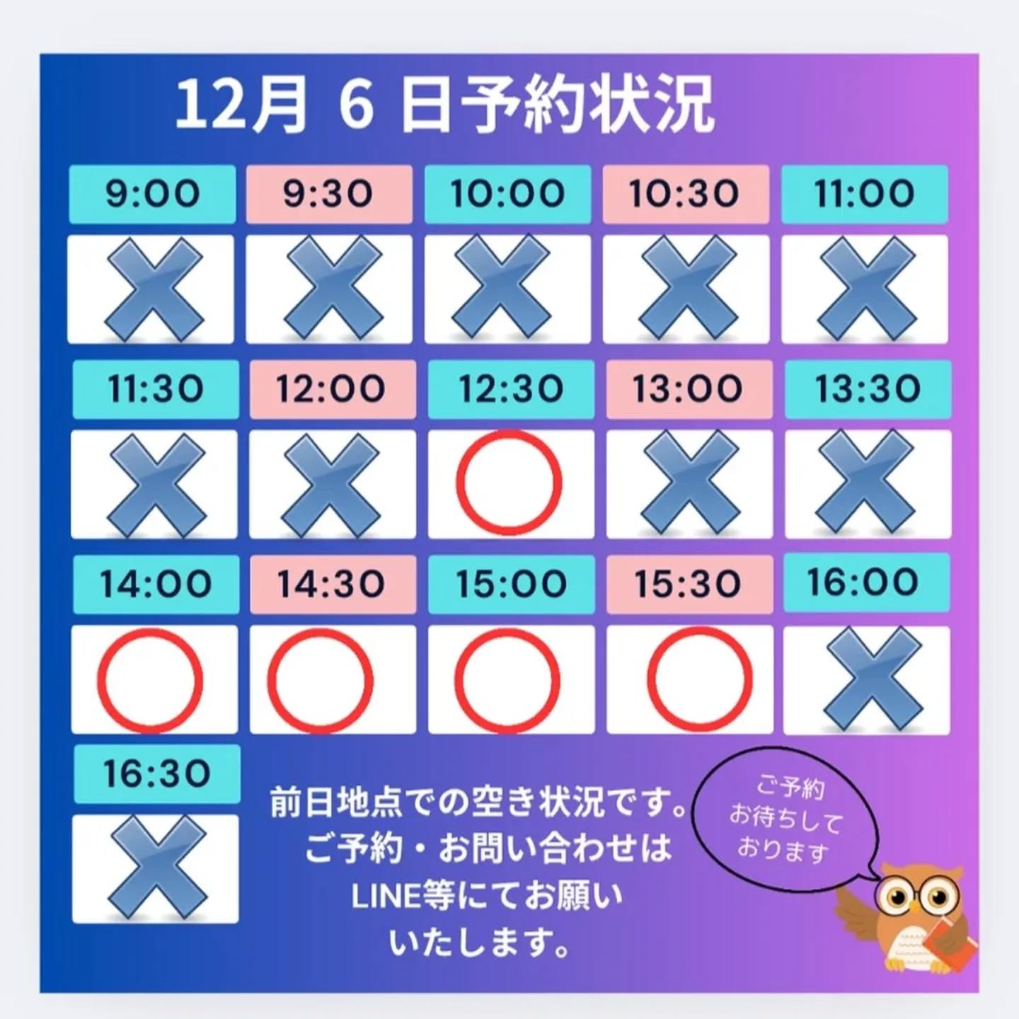 当日のご予約は、LINE等にてお問い合わせください。