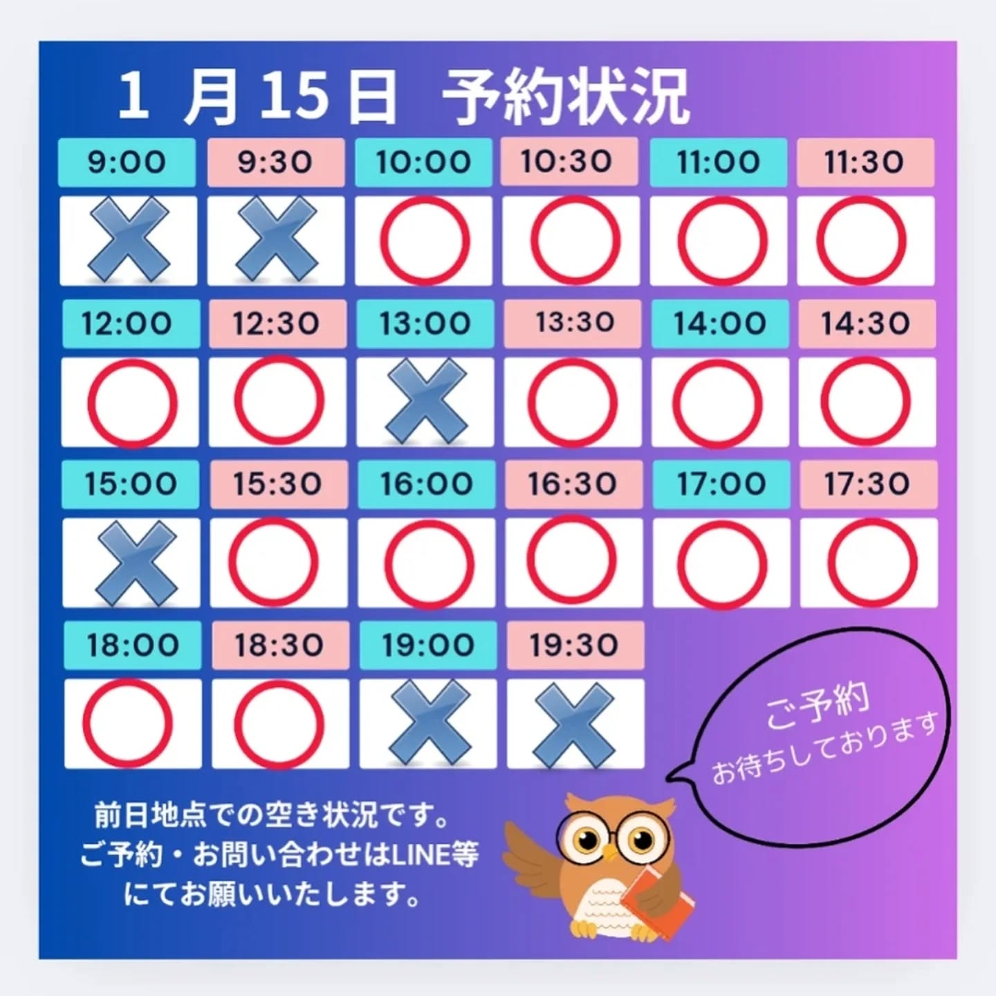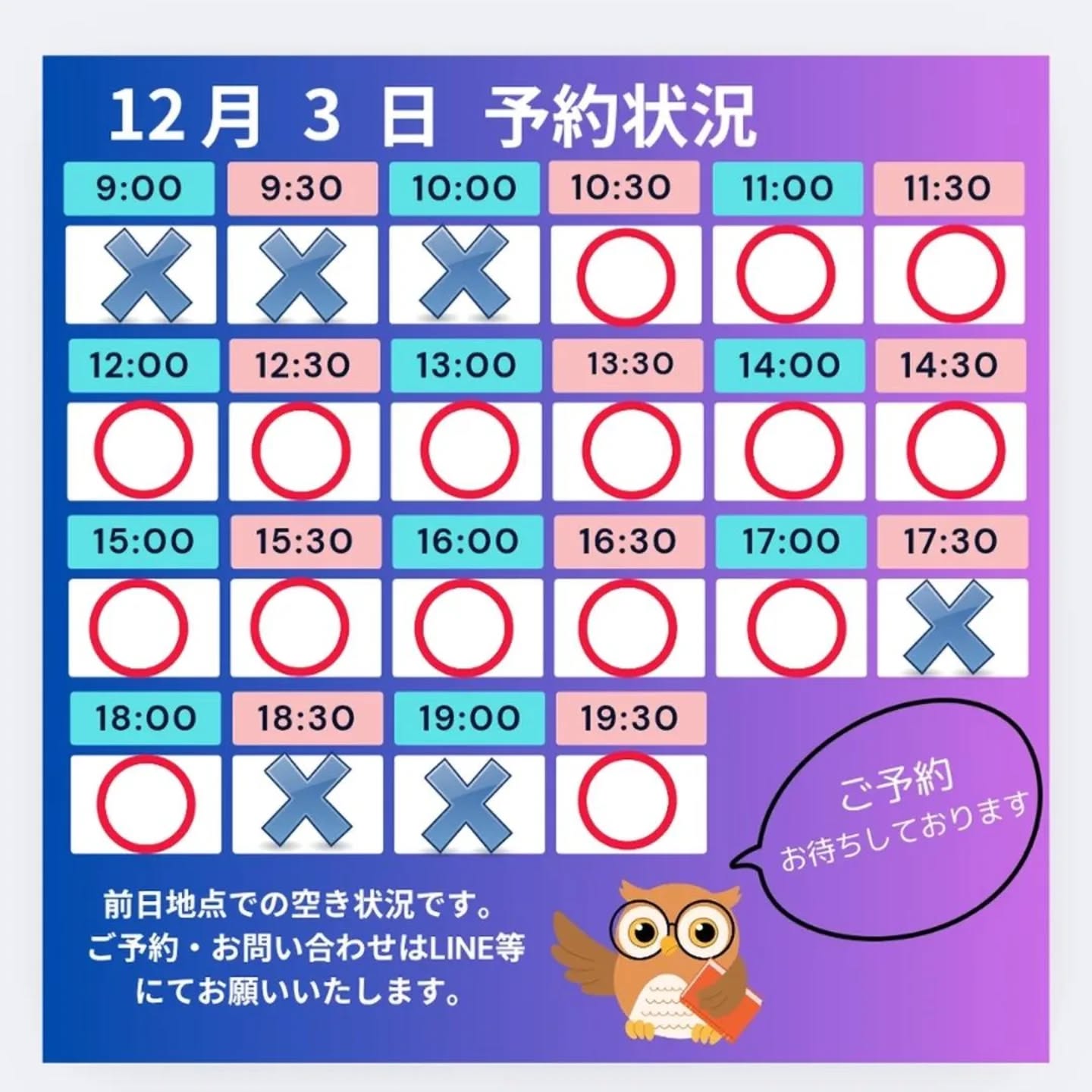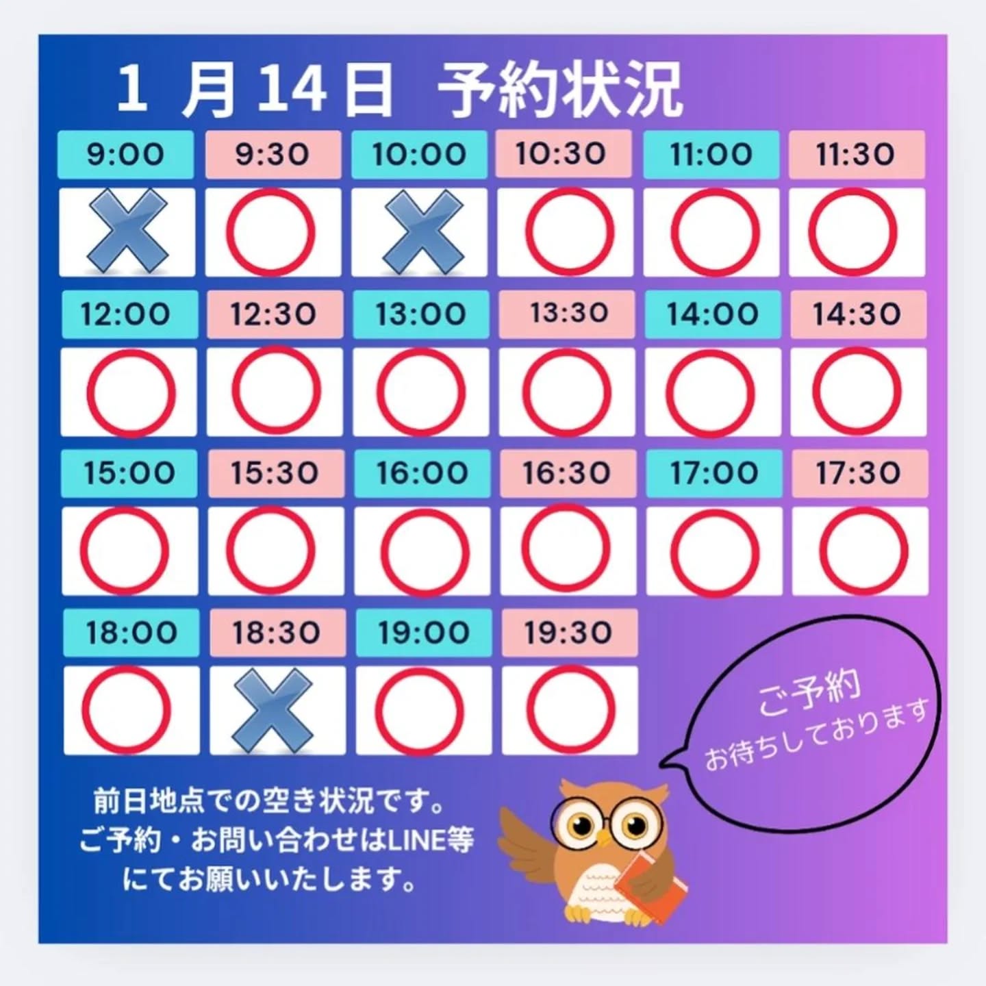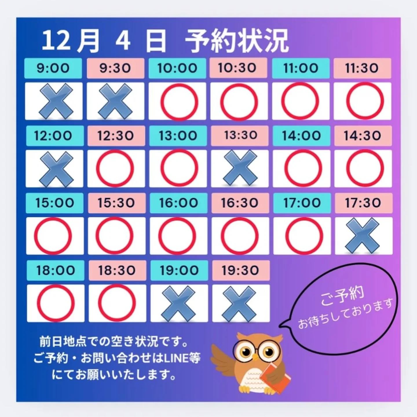 当日のご予約は、LINE等にてお問い合わせください。
