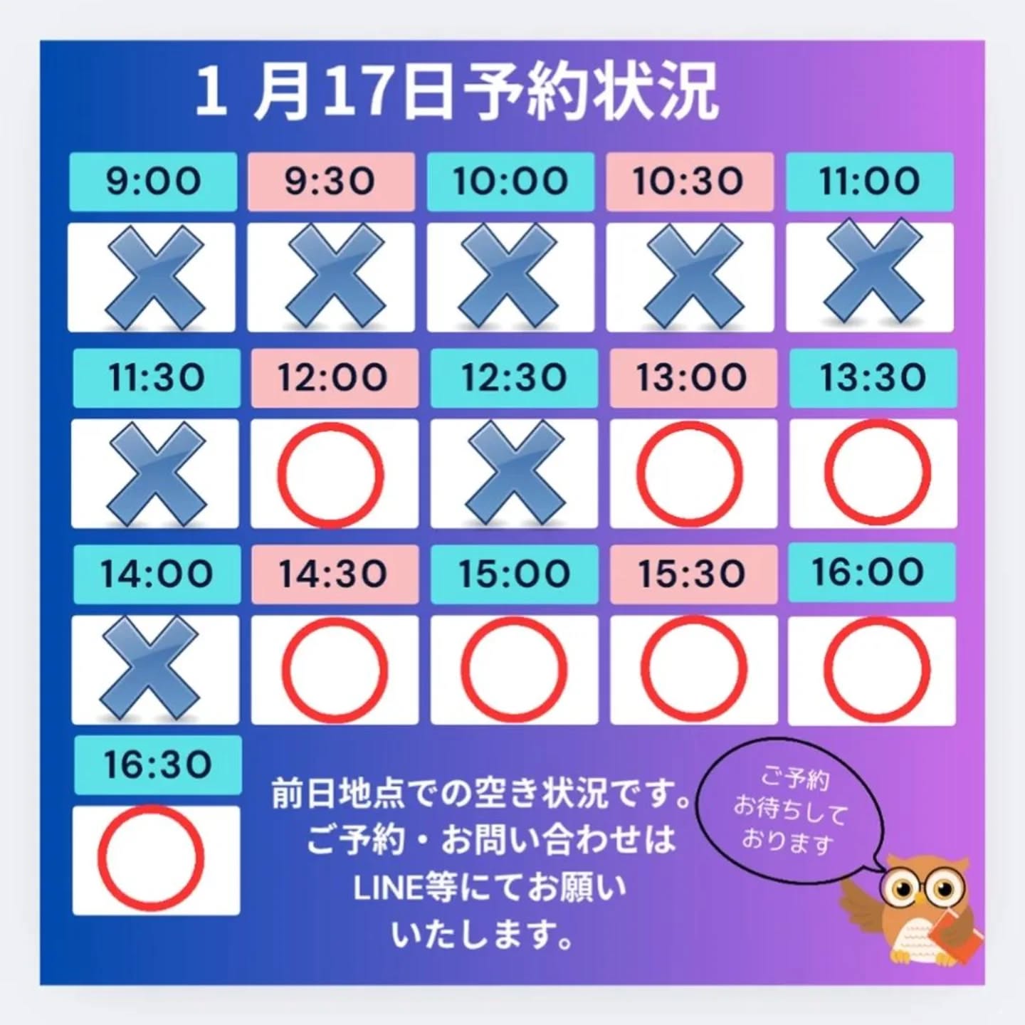 当日のご予約は、LINE等にてお問い合わせください。
