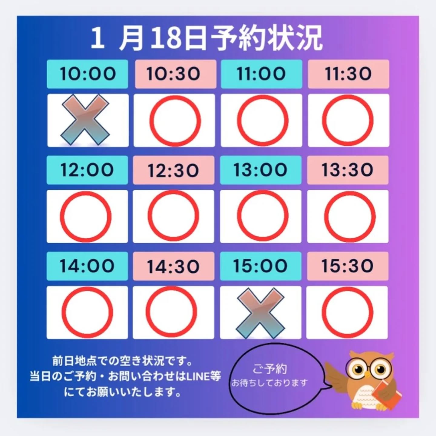 当日のご予約は、LINE等にてお問い合わせください。
