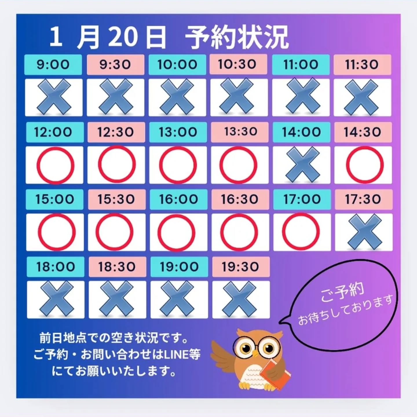 当日のご予約は、LINE等にてお問い合わせください。