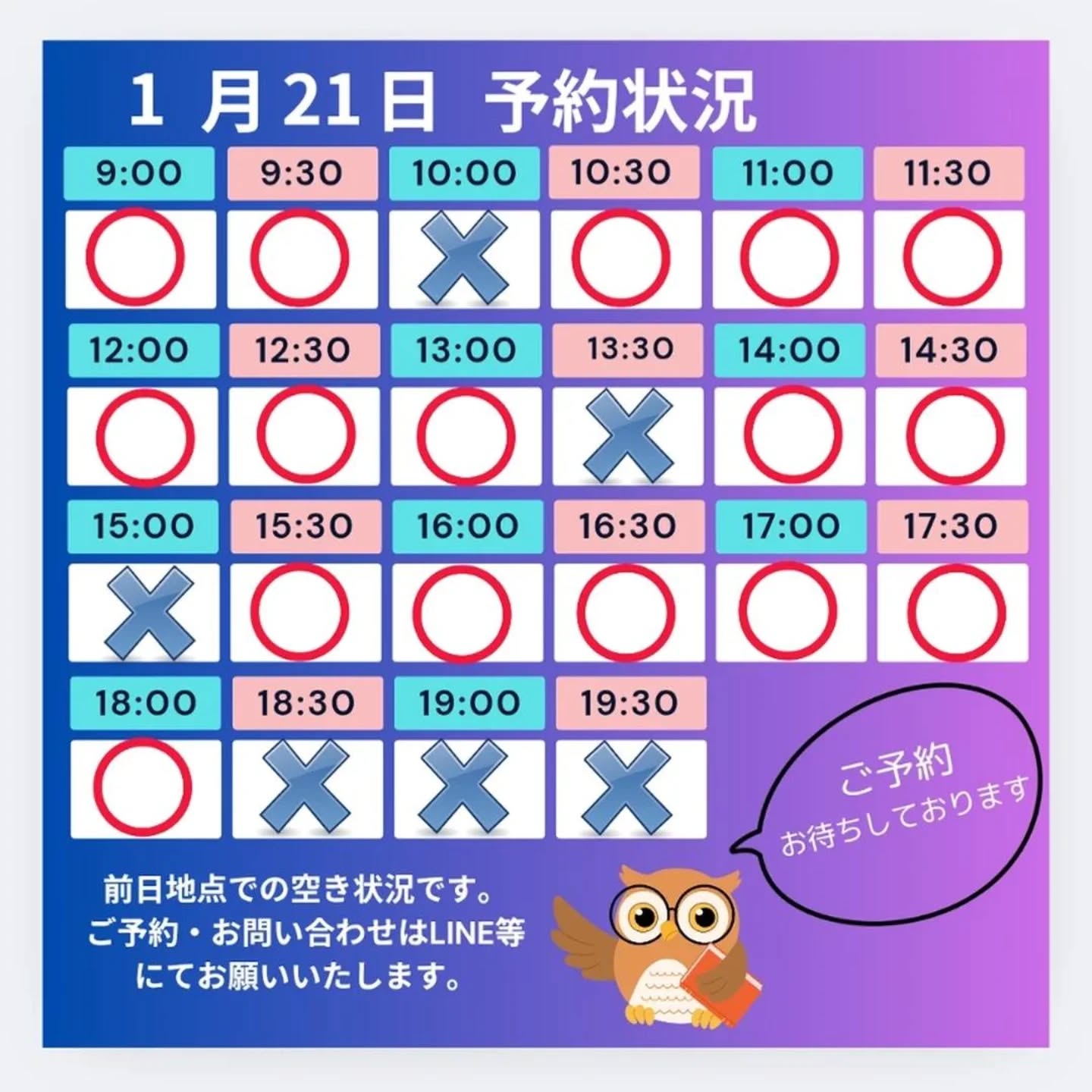 当日のご予約は、LINE等にてお問い合わせください。