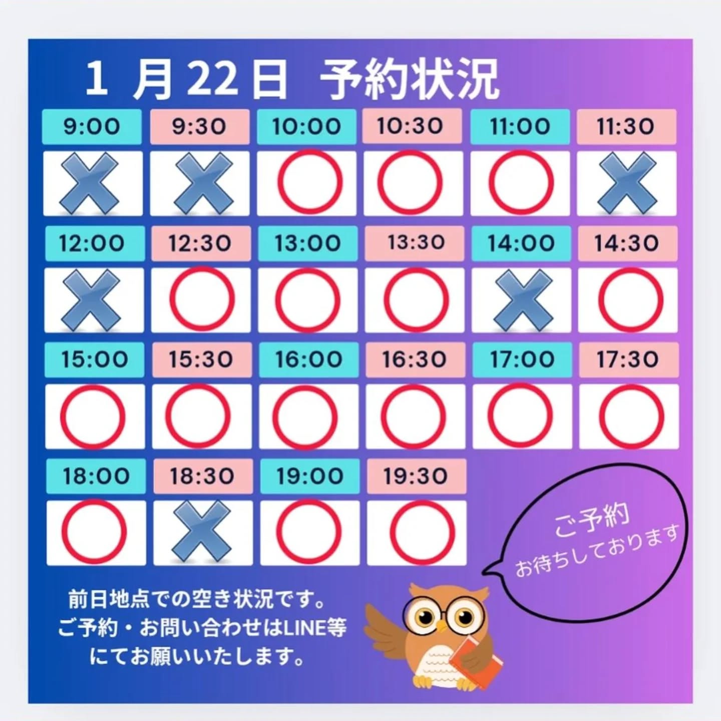 当日のご予約は、LINE等にてお問い合わせください。